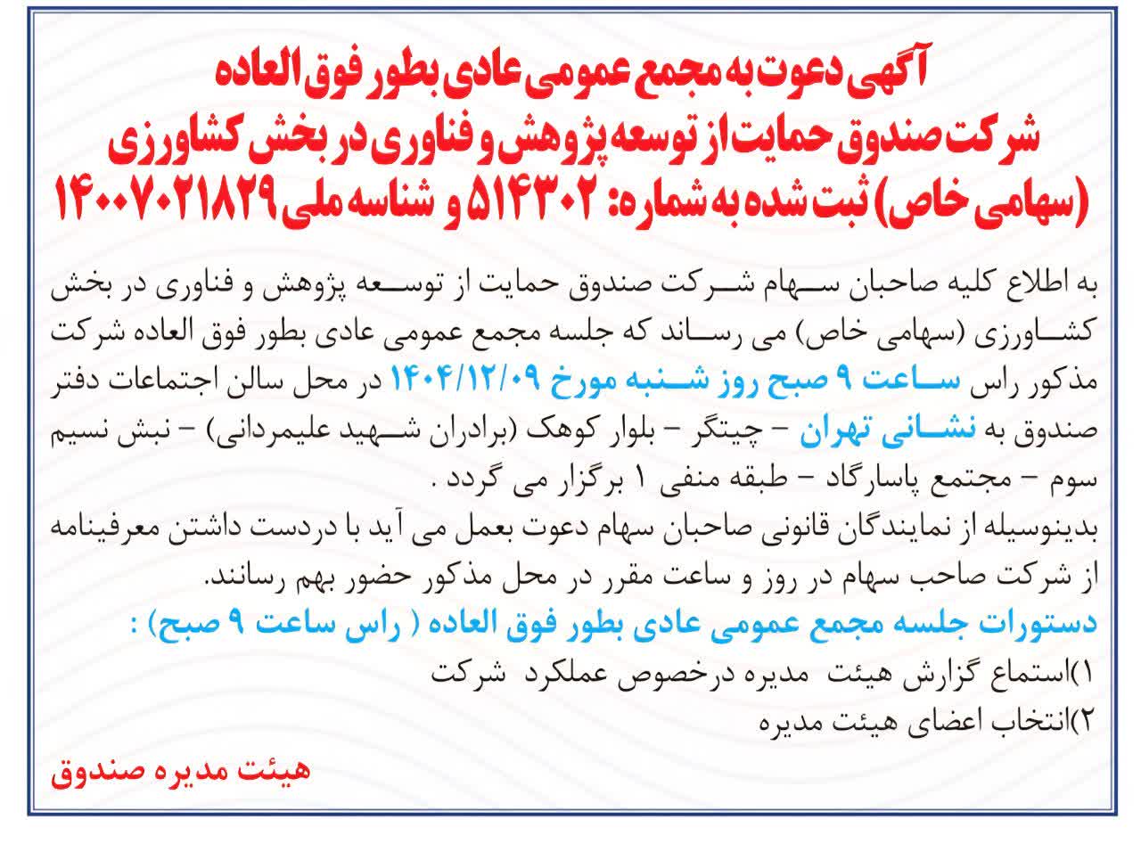 مجمع عمومی عادی به طور فوق العاده صندوق فوریه 24, 2026 ارسال شده توسط admin_27876fgd7 اخبار صندوق 4 بازدید اشتراک گذاری: مطالب زیر را حتما مطالعه کنید تفاهم نامه صندوق پژوهش با تجار ارمنستان نمایشگاه محصولات کشاورزی و نشست های مشاوره و مدیریت صادرات دانش بنیان دکتر مجید ولدان به عنوان سرپرست معاونت برنامه ریزی و امور اقتصادی سازمان معرفی شد پرداخت تسهیلات ارزان به شرکتهای دانش بنیان حوزه کشاورزی اجرای طرح توسعه بازار کالای دانش بنیان در شهرستان سرایان و بهبود عملکرد محصول پسته، زعفران و رفع معضل دانه سفیدی انار گزارش مجمع عمومی بطور فوق العاده ۱۳۹۸/۱۱/۲۶